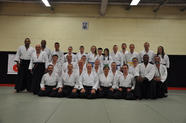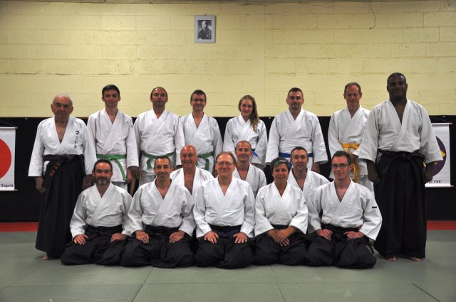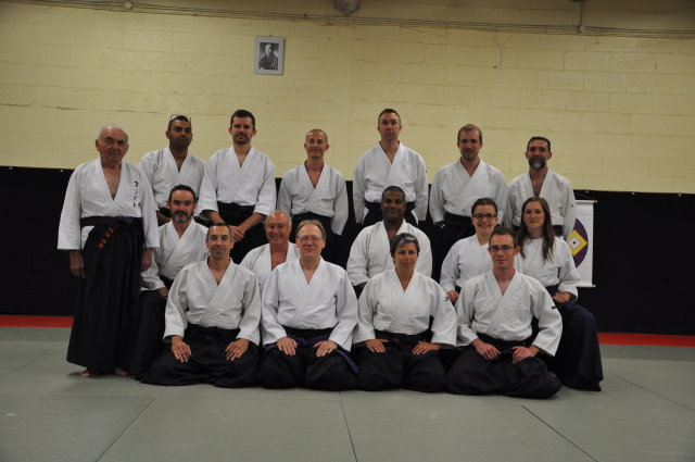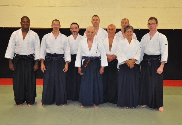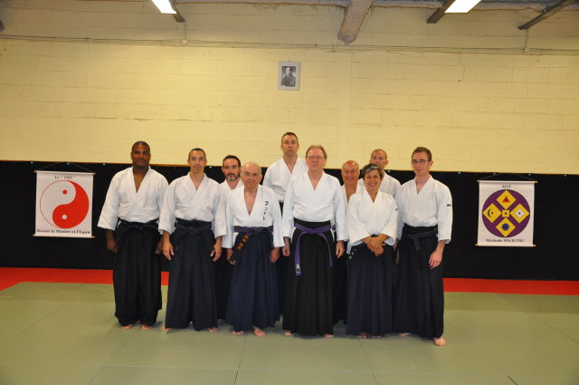 Le groupe des Ceintures Noires à liserés violets, présentes lors de cette cérémonie afin de fêter la remise du Titre de Chuden de M. André Touchet. Un long chemin parcouru depuis 2005 lors de sa nomination de "Sho-Mokuroku", Ceinture Noire 1er Stade des Valeurs. (Voir : Une nomination exceptionnelle!) |